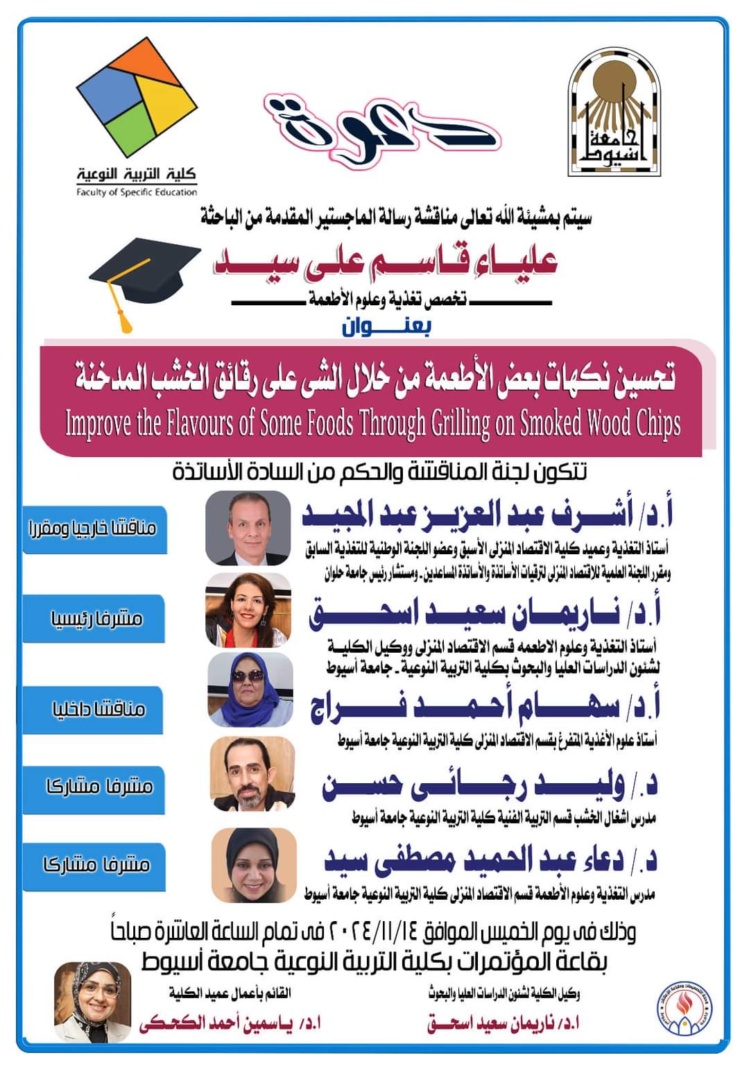 والأستاذ الدكتور/ هند اليداك نتشرف بدعوة سيادتكم لحضور مناقشة رسالة ماجستير للباحثة / علياء قاسم على سيد بقسم الإقتصاد المنزلى تخصص تغذية وعلوم الأطعمة