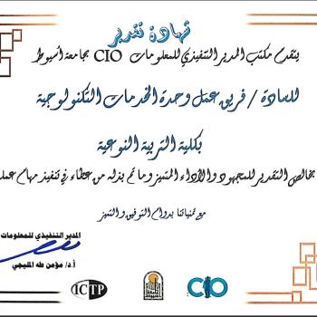 حصلت وحدة الخدمات الإلكترونية بكلية التربية النوعية علي شهادة شكر وتقدير