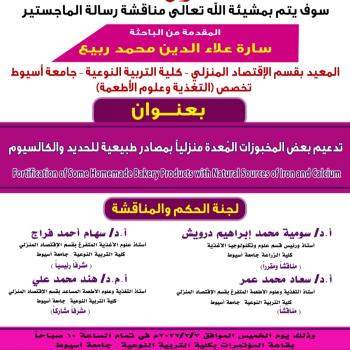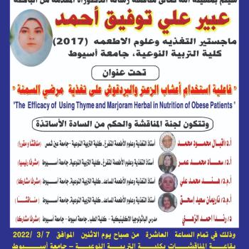 دعوة لحضور مناقشة رسالة دكتوراه الباحثة/ عبير علي توفيق - بقسم الاقتصاد المنزلي