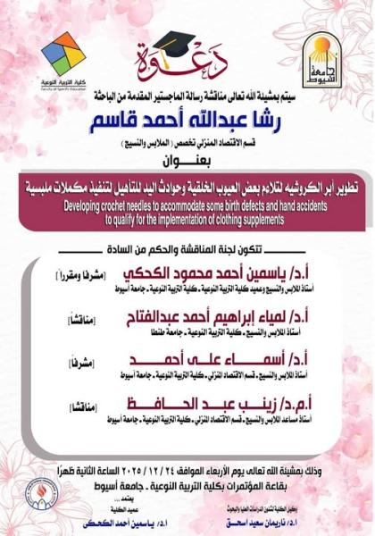 حت رعاية معالي الأستاذ الدكتور/ أحمد المنشاوي – رئيس جامعة أسيوط معالي الأستاذ الدكتور/ جمال بدر – نائب رئيس الجامعه لشئون الدراسات العليا والبحوث الأستاذ الدكتور/ ياسمين الكحكي – عميد الكلية الأستاذ الدكتور/ ناريمان إسحق – وكيل الكلية لشئون الدراسات العليا والبحوث الاستاذ الدكتور/ هند محمد علي ـ رئيس قسم الاقتصاد المنزلي نتشرف بدعوة سيادتكم لحضور مناقشة رسالة الماجستير المقدمة من الباحثة / رشا عبدالله أحمد قاسم ـ تخصص الملابس والنسيج بعنوان : "تطوير إبر الكروشيه لتلائم بعض العيوب الخلقية وحوادث اليد للتأهيل لتنفيذ مكملات ملبسية" وذلك بمشيئة الله تعالي يوم الاربعاء الموافق ٢٤ ديسمبر ٢٠٢٥ في تمام الساعة الثانية ظهراً بقاعة المؤتمرات بكلية التربية النوعية - جامعة أسيوط. مع أطيب الأمنيات للباحثة بمزيد من التوفيق والنجاح