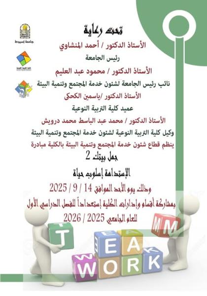 حت رعاية الأستاذ الدكتور/ أحمد المنشاوي – رئيس الجامعة الأستاذ الدكتور/ محمود عبد العليم – نائب رئيس الجامعة لشئون خدمة المجتمع وتنمية البيئة الأستاذ الدكتور/ ياسمين الكحكي – عميد الكلية الأستاذ الدكتور/ محمد عبد الباسط محمد درويش – وكيل الكلية لشئون خدمة المجتمع وتنمية البيئة يسر قطاع شئون خدمة المجتمع وتنمية البيئة بالكلية أن يعلن عن مبادرة (جمّل بيتك 2) بعنوان " الاستدامة أسلوب حياة " وذلك يوم الأحد الموافق 14 / 9 / 2025 بمشاركة أقسام وإدارات الكلية استعدادًا للفصل الدراسي الأول من العام الجامعي 2025 / 2026 معاً نحو بيئة جامعية أفضل ..