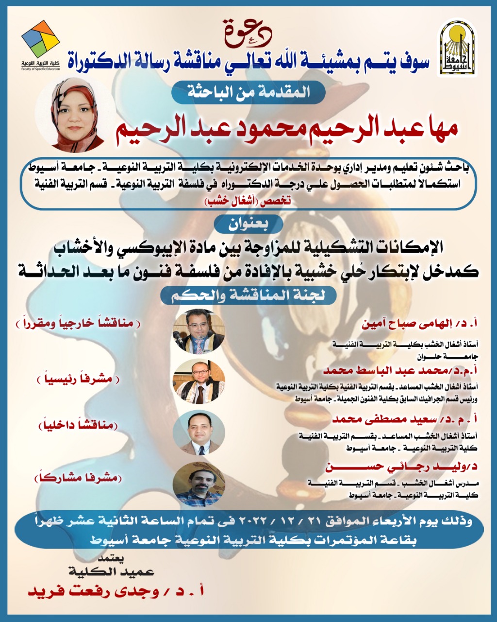 والأستاذ الدكتور /محمد عبد الباسط محمد – أستاذ أشغال الخشب المساعد-بقسم التربية الفنية بكلية التربية النوعية-ورئيس قسم الجرافيك السابق بكلية الفنون الجميلة-جامعة أسيوط ( مشرفاً رئيسياً )