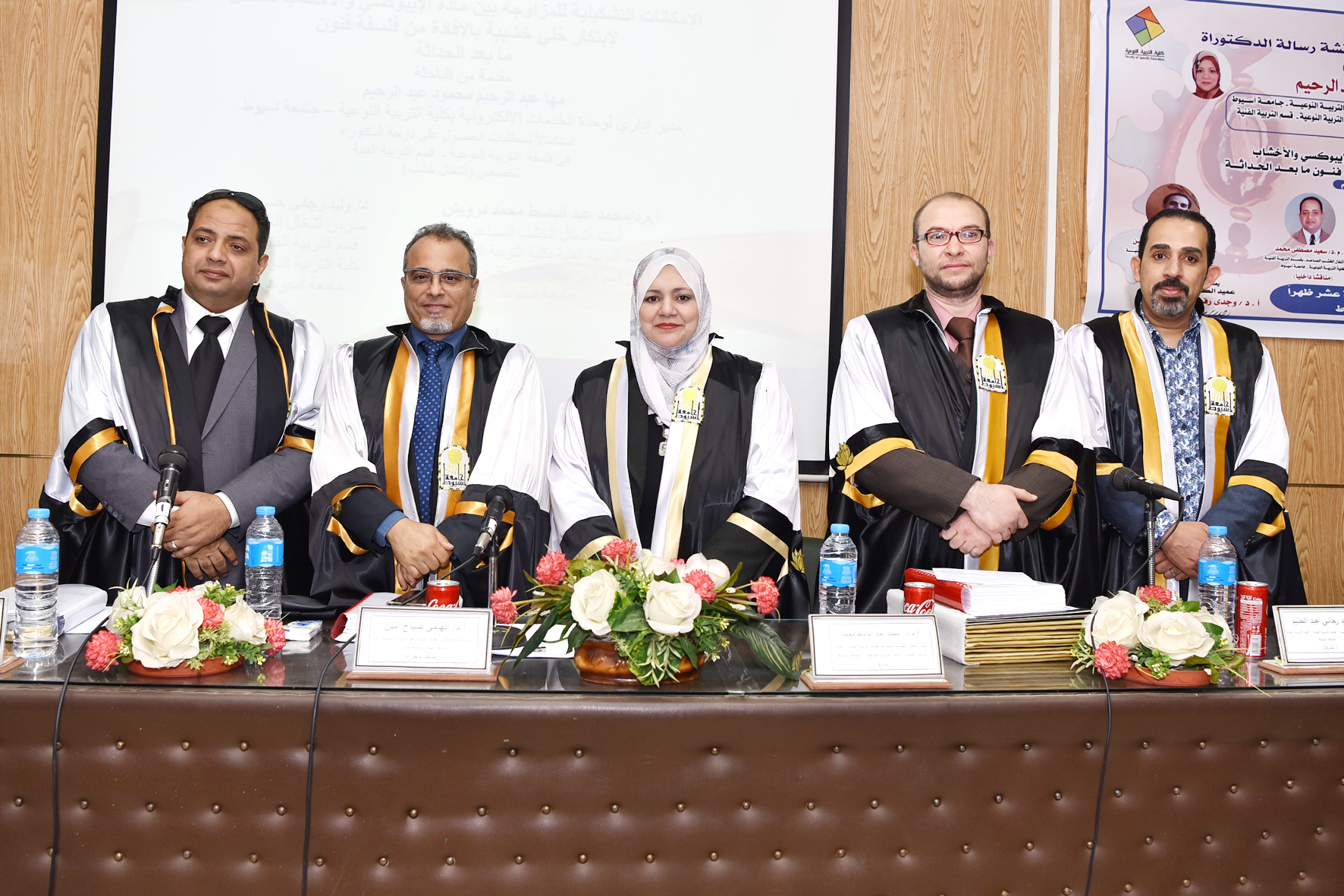وأعلن السيد الاستاذ الدكتور إلهامي صباح آمين بعد تدوال لجنة الحكم والمناقشة انه تمت الموافقة علي منح الباحثة درجة الدكتوراه في فلسفة التربية النوعية - قسم التربية الفنية تخصص (أشغال خشب) مع توصية بطابعة الرسالة علي CD مدمج وتداولها بين كليات الفنون والتربية الفنية لما لها من قيمه في مجال التخصص