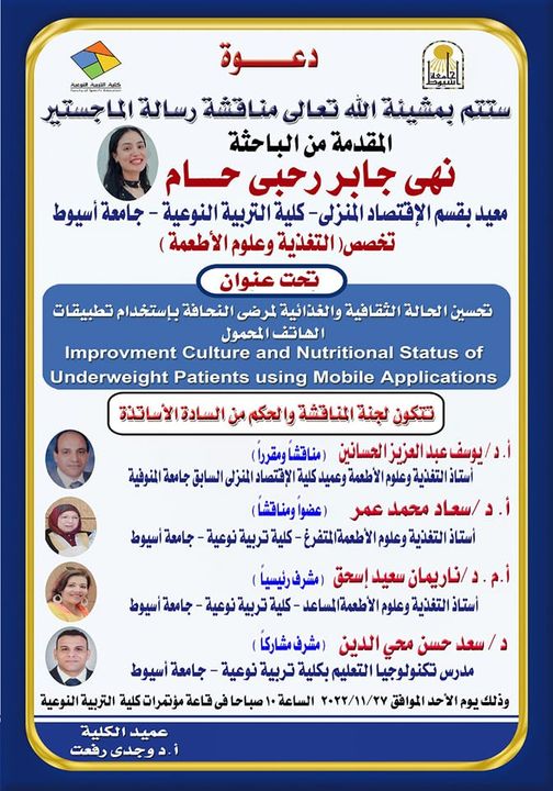 دعوة لحضور مناقشة ماجستير الباحثة / نهي رحبي حام - بقسم الاقتصاد المنزلي