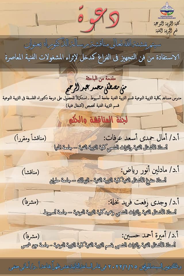 د /سعيد مصطفى محمد حامد لترقية سيادته لدرجة أستاذ مساعد تخصص أشغال خشب بقسم التربية الفنية .. مع تمنياتنا بدوام النجاح والتميز