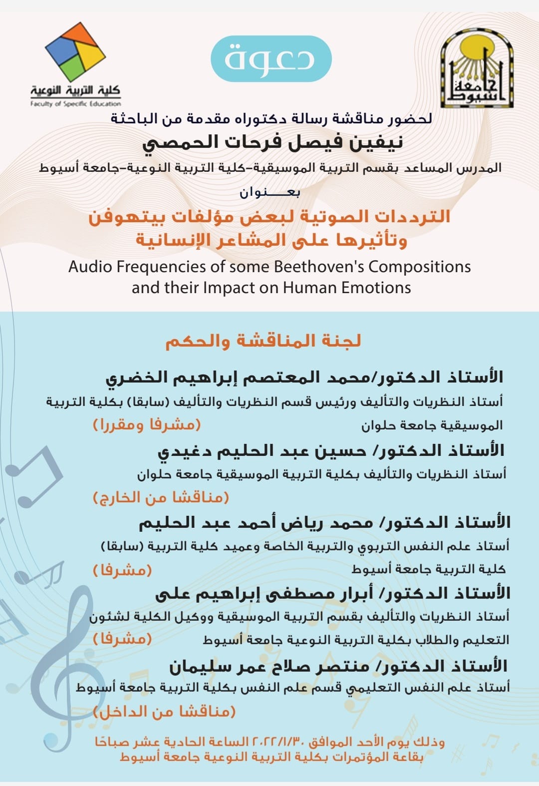 يتقدم قسم التربية الموسيقية بكلية التربية النوعية جامعة أسيوط بخالص التهانى والتبريكات للزميلة والأخت الفاضلة د/ نيفين فيصل فرحات لحصولها على درجة دكتوراه الفلسفة فى التربية النوعية فى التربية الموسيقية تخصص نظريات وتأليف .. خالص التمنيات بالتوفيق والنجاح