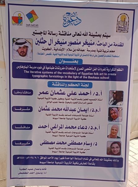 تم مناقشة رسالة ماجستير للباحث / منيخر منصور منيخر آل حثلين (باحث كويتى) ، وحصوله على درجة الماجستير فى التربية الفنية تخصص " طباعة منسوجات "