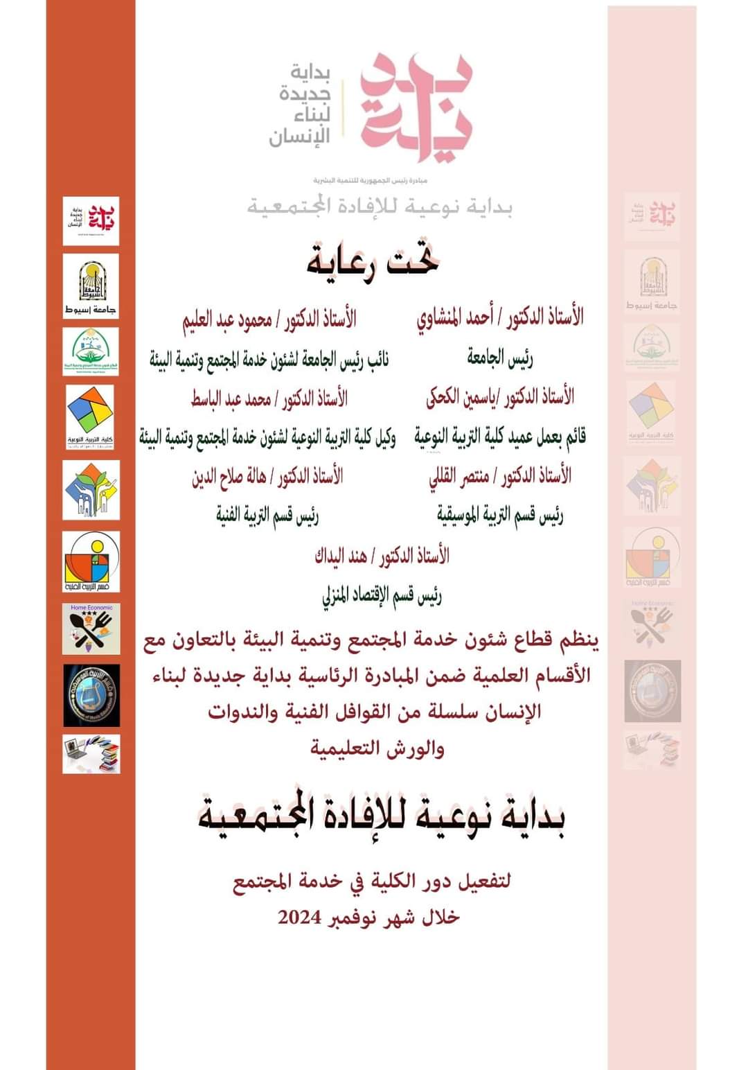 ينظم قطاع خدمة المجتمع وتنمية البيئة بالتعاون مع الأقسام العلمية ضمن المبادرة الرئاسية بداية جديدة لبناء الإنسان سلسلة من القوافل الفنية والندوات والورش التعليمية تحت مسمى