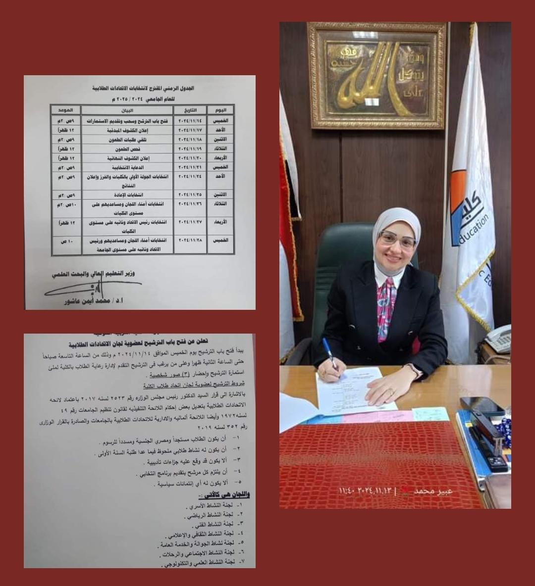 تعلن كلية التربية النوعية عن بدأ التقدم لانتخابات اتحاد طلاب الكلية ابتداءا من اليوم الخميس الموافق ١٤ نوفمبر ٢٠٢٤م وفتح باب الترشيح من الساعة التاسعة صباحا حتى الساعة الثانية ظهرا وعلى من يرغب فى الترشح التوجه إدارة رعاية الطلاب بالكلية.