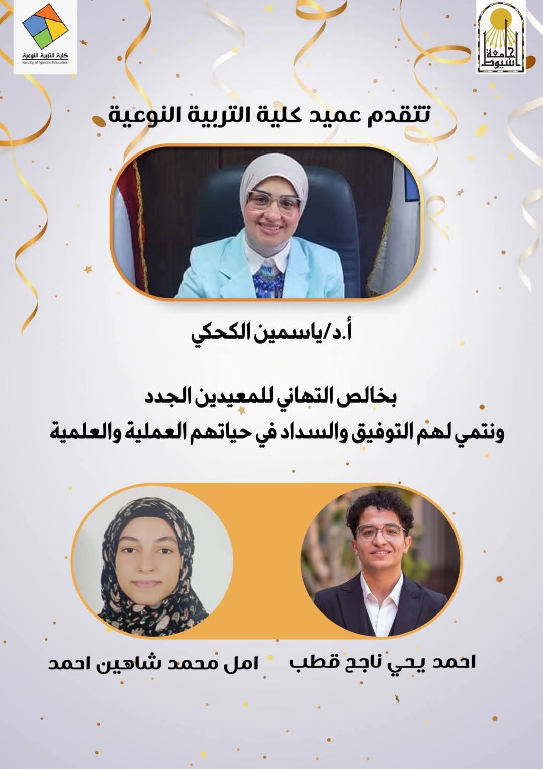 تتقدم الأستاذ الدكتور/ ياسمين الكحكى عميدة كلية التربية النوعية بأسيوط بخالص الشكر والتقدير للأستاذ الدكتور/ أحمد المنشاوى رئيس جامعة أسيوط لصدور قرار ستيادته بتعيين المعيدين