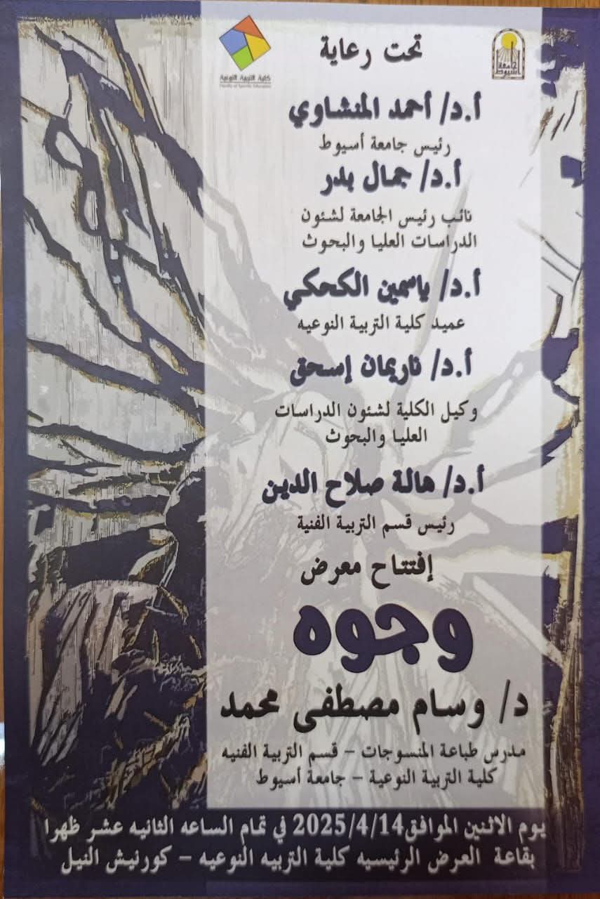 تتشرف الكلية بدعوة سيادتكم لحضور إفتتاح معرض بعنوان " وجوه " للدكتور/ وسام مصطفى محمد - مدرس طباعة المنسوجات بقسم التربية الفنية