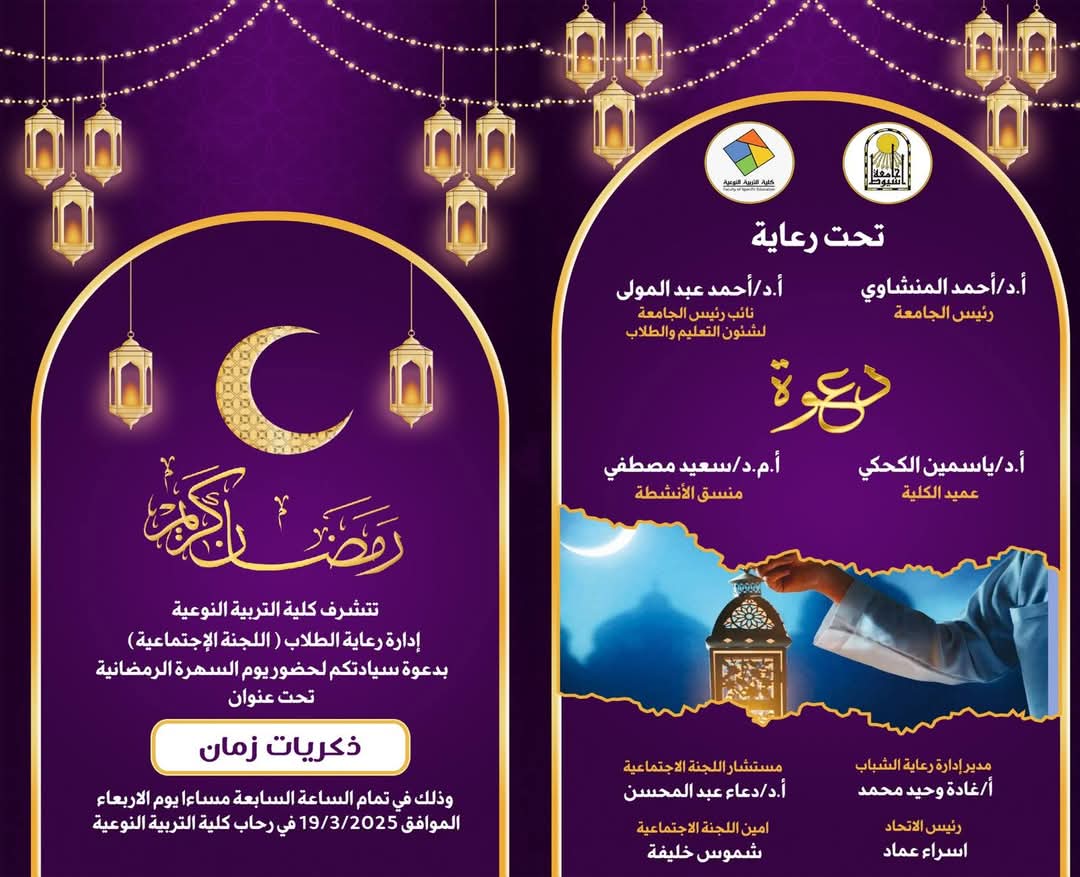 تتشرف عميدة الكلية بدعوة السادة الأفاضل أعضاء هيئة التدريس ومعاونيهم والجهاز الإدارى وموظفى الكلية وأبنائنا وبناتنا طلاب وطالبات الأقسام العلمية لحضور السهرة الرمضانية " ذكريات زمان " والتى تنظمها إدارة رعاية الطلاب بالكلية وذلك يوم الأربعاء الموافق ١٩ مارس ٢٠٢٥م الساعة ٧ مساءا فى رحاب كلية التربية النوعية بأسيوط.