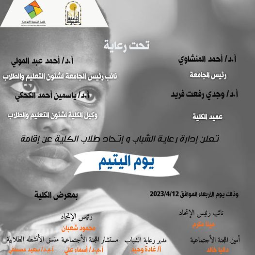 اليوم الأربعاء الموافق 4/12 نظمت إدارة رعاية الشباب بالتعاون مع اتحاد طلاب كلية التربية النوعية جامعة اسيوط احتفالية بيوم اليتيم پقاعة العرض بالكلية