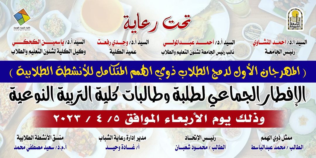 المهرجان الأول لدمج طلاب ذوى الهمم وافطار جماعة لطلبة وطالبات كلية التربية النوعية 4 أبريل 2023 المهرجان الأول لدمج طلاب ذوى الهمم وافطار جماعة لطلبة وطالبات كلية التربية النوعية