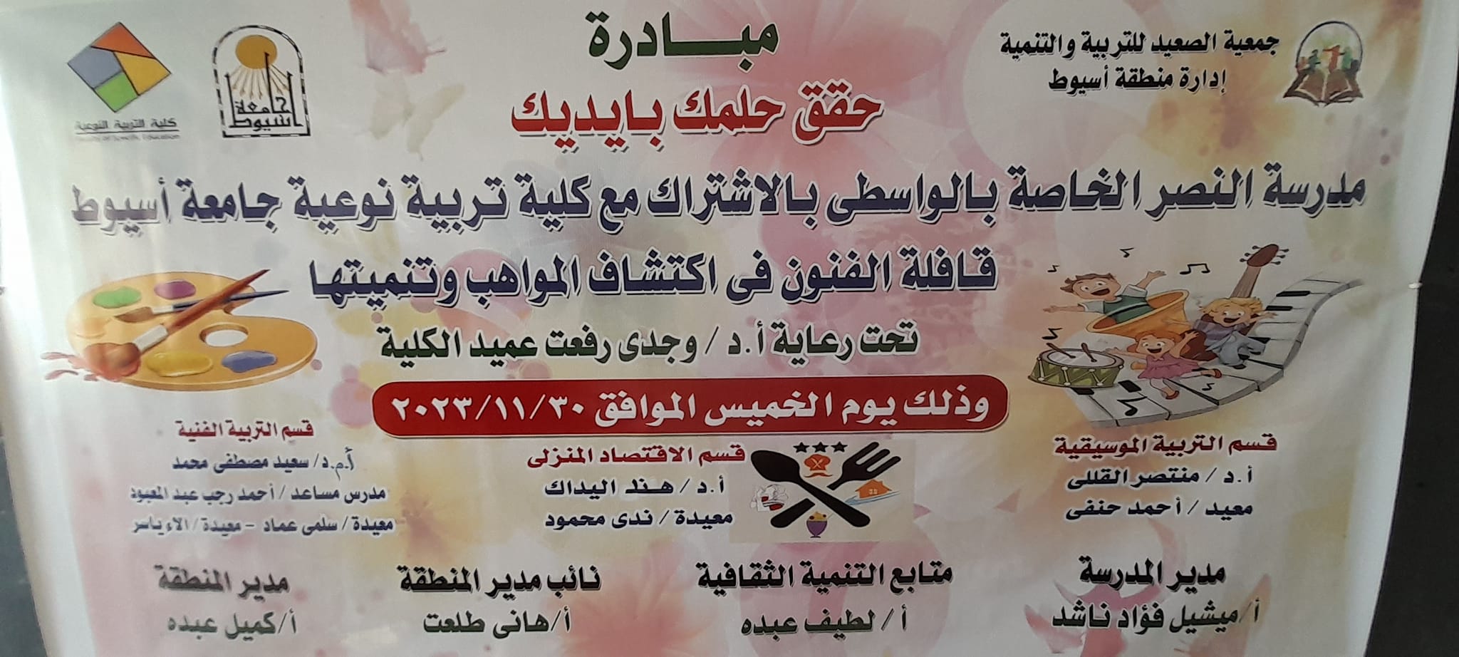 القافلة التنموية الفنية التى تم عملها بعنوان( حقق حلمك بايدك ) والتى توجهت من كلية التربية النوعية لمدرسة النصر الخاصة بالواسطى اليوم الخميس الموافق ٣٠ نوفمبر ٢٠٢٣ م