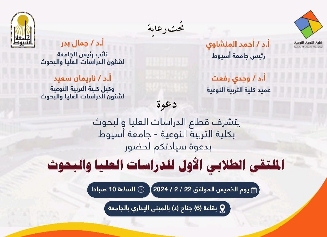 بالتوفيق لكل الباحثين المتميزين المشاركين في الملتقي الطلابي الاول للدراسات العليا والبحوث 20 فبراير 2024 بالتوفيق لكل الباحثين المتميزين المشاركين في الملتقي الطلابي الاول للدراسات العليا والبحوث