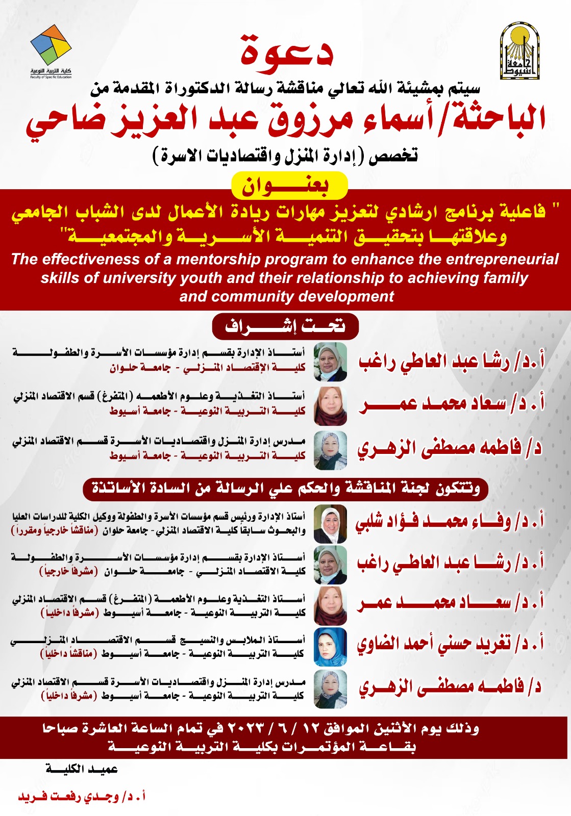 دعوة لحضور مناقشة رسالة دكتوراه بقسم الاقتصاد المنزلي للباحثة / أسماء مرزوق 10 يونيو 2023 دعوة لحضور مناقشة رسالة دكتوراه بقسم الاقتصاد المنزلي للباحثة / أسماء مرزوق