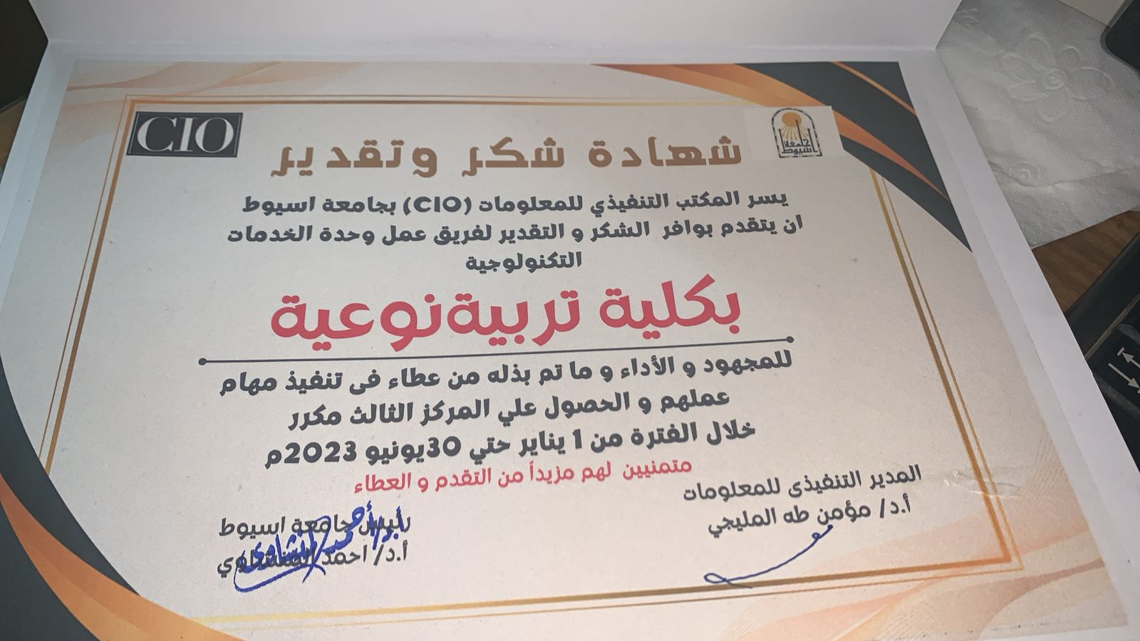 فوز فريق العمل بوحدة الخدمات الإلكترونبة بالمركز الثالث علي مسنوي جامعه اسيوط 30 نوفمبر 2023 فوز فريق العمل بوحدة الخدمات الإلكترونبة بالمركز الثالث علي مسنوي جامعه اسيوط