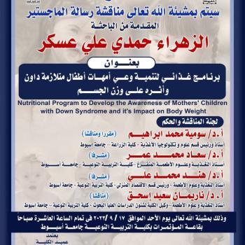 تتقدم أسرة قسم الاقتصاد المنزلي بدعوة سيادتكم لحضور مناقشة الماجستير للباحثة/ الزهراء حمدي علي…