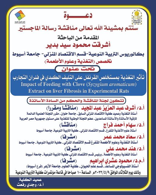 يتشرف قسم الاقتصاد المنزلي بدعوة سيادتكم لحضور مناقشة رسالة الماجستير للباحثة/ أشرقت محمود تخصص التغذية وعلوم الأطعمة وذلك يوم الثلاثاء الموافق ٩/ ٥ الساعة العاشرة صباحاً بقاعة المؤتمرات بالكلية ...ألف ألف مبروووك للباحثة وبالتوفيق دائما للسادة المشرفين وأعضاء لجنة المناقشة والحكم