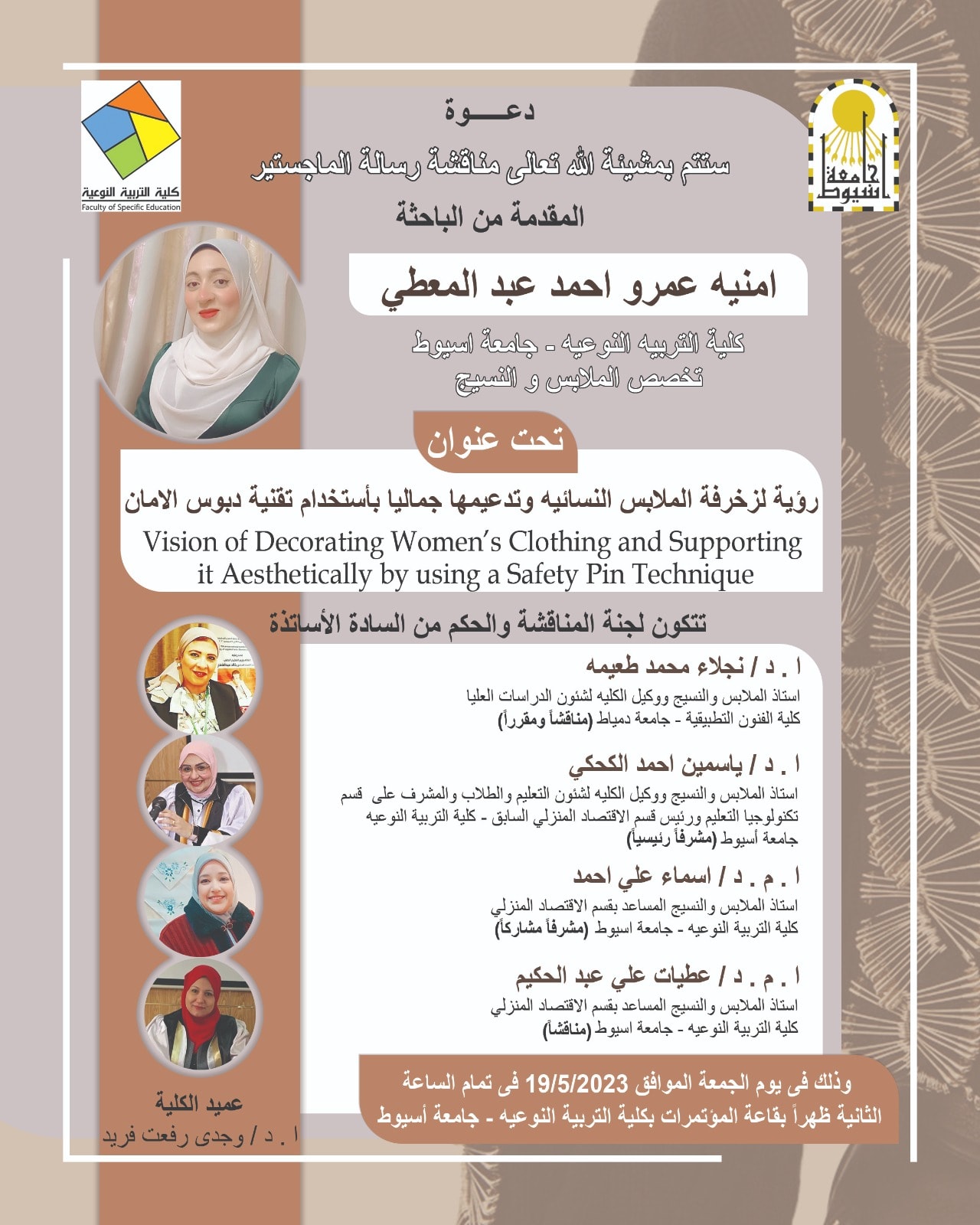 يتشرف قسم الاقتصاد المنزلي بدعوة سيادتكم لحضور مناقشة ماجستير تخصص الملابس والنسيج للباحثة أمنية عمرو 19 مايو 2023 يتشرف قسم الاقتصاد المنزلي بدعوة سيادتكم لحضور مناقشة ماجستير تخصص الملابس والنسيج للباحثة أمنية عمرو يوم يوم الجمعة الموافق ١٩ / ٥ /٢٠٢٣م الساعة الثانية ظهراً.