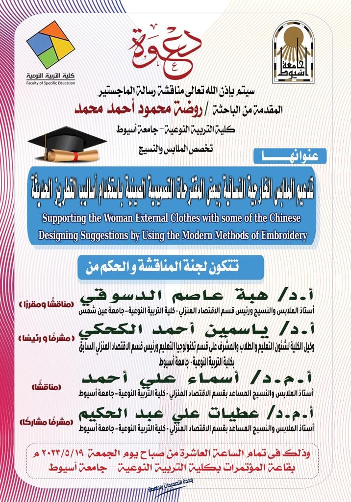 يتشرف قسم الاقتصاد المنزلي بدعوة سيادتكم لحضور مناقشة ماجستير تخصص الملابس والنسيج للباحثة - روضة محمود 18 مايو 2023 يتشرف قسم الاقتصاد المنزلي بدعوة سيادتكم لحضور مناقشة ماجستير تخصص الملابس والنسيج للباحثة - روضة محمود يوم الجمعة الموافق ١٩ / ٥ /٢٠٢٣م الساعة العاشرة صباحاً
