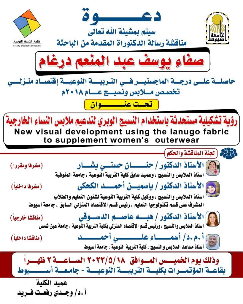يتشرف قسم الاقتصاد المنزلي بدعوة سيادتكم لحضور مناقشة رسالة دكتوراه تخصص الملابس والنسيج للباحثة صفاء يوسف 19 مايو 2023 يتشرف قسم الاقتصاد المنزلي بدعوة سيادتكم لحضور مناقشة رسالة دكتوراه تخصص الملابس والنسيج للباحثة صفاء يوسف يوم الخميس الموافق ١٨ / ٥ /٢٠٢٣م الساعة الثانية ظهراً. بقاعة المؤتمرات بالكلية