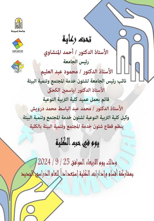 ينظم قطاع خدمة المجتمع وتنمية البيئة بالكلية يوم فى حب الكلية وذلك يوم الأربعاء الموافق ٢٥ سبتمبر ٢٠٢٤م