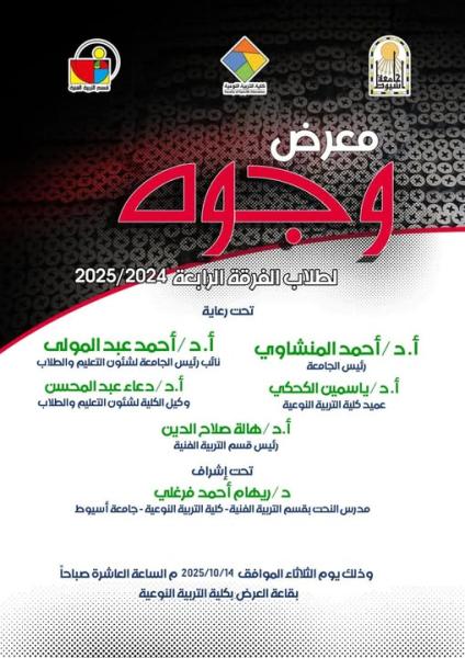 <p>Professor Dr. Ahmed El-Menshawy – President of Assiut University<br>Professor Dr. Ahmed Abdel-Mawla – Vice President of the University for Education and Student Affairs<br>Professor Dr. Yasmin El-Kahky – Dean of the Faculty of Specific Education<br>Professor Dr. Doaa Abdel Mohsen – Vice Dean for Education and Student Affairs<br>Professor Dr. Hala Salah El-Din – Head of the Art Education Department<br><br>The Faculty of Specific Education – Assiut University is honored to invite you to attend the opening of the art exhibition "Faces" for fourth-year students (2024/2025) under the supervision of Dr. Riham Ahmed Farghaly – Lecturer of Sculpture in the Art Education Department. The event will be held on Tuesday, October 14, 2025, at 10:00 AM in the exhibition hall of the Faculty of Specific Education – Assiut University.<br><br>With our best wishes for continued success and achievement 🌹<br>#SpecificEducation_Assuit</p>