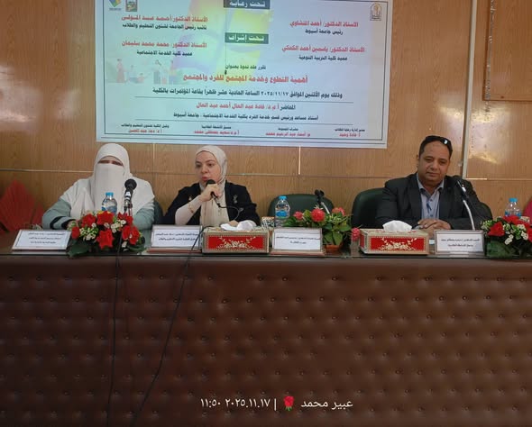 Under the patronage of His Excellency Prof. Dr. Ahmed Al-Manshawi – President of the University, His Excellency Prof. Dr. Ahmed Abd Al-Mawla – Vice President of the University for Education and Student Affairs, Prof. Dr. Yasmin Ahmed El-Kahki – Dean of the Faculty of Specific Education, and Prof. Dr. Doaa Mohamed Al-Mohsen – Vice Dean for Education and Student Affairs, the Student Care Department – (Social Committee) organized a seminar entitled: "The Importance of Volunteering and Community Service for the Individual and Society." This was in line with the faculty's keenness to promote a culture of volunteer work, raise students' awareness of their social role, and enhance their positive participation in serving the community.