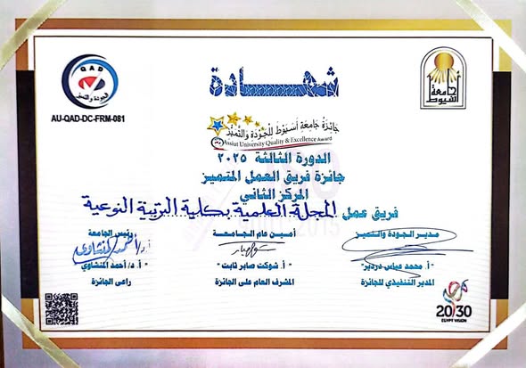 The Faculty of Specific Education Shines in the Quality and Excellence Award at Assiut University 2025 🌟 Within the framework of Assiut University's commitment to achieving and enhancing quality and excellence standards across all its sectors and among its academic and administrative staff, the university celebrated the distribution of the "Quality and Excellence Award" in its third consecutive session. The ceremony was held under the auspices of: His Excellency Professor Dr. Ahmed El-Manshawy – President of the University, and in the presence of: His Excellency Professor Dr. Ahmed Abdel Mawla – Vice President for Education and Student Affairs, Professor Dr. Yasmin El-Kahky – Dean of the Faculty, Professor Dr. Nariman Ishaq – Vice Dean for Graduate Studies and Research, and a group of the university's academic and administrative leaders. Members of the Scientific Journal team at the Faculty of Specific Education were honored for winning second place at the university level in the category of Best Distinguished Work Team. This achievement adds a new milestone to its record of successes in recognition of their efforts and contributions to serving scientific research and the academic community. Professor Dr. Yasmin El-Kahky – Dean of the Faculty, extends sincere thanks and appreciation to all those involved in this accomplishment.