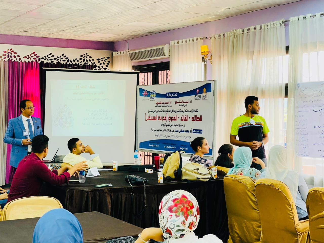 وقد اوضح الدكتور محمد مصطفى حمد ان المدرب هو قائد مؤثر وتدريب " مدربي المستقبل " يلهم طلاب جامعة اسيوط بالمهارات القيادية المؤثرة فى الاخر وشدد على اهمية استخدام الخامات المتاحة فى البيئة كادوات فى التدريب التفاعلي .