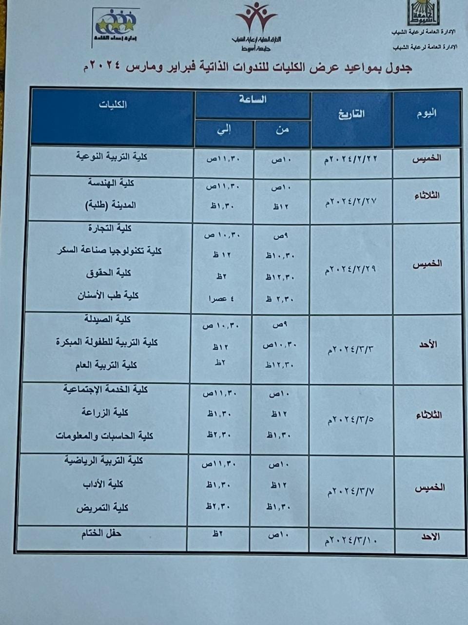 إدارة اعداد القادة ورعاية المتميزين .. جدول تسابق الندوات الطلابية الذاتية على مستوى الكليات والمدن الجامعية الأسبوع القادم ان شاء الله...والبداية مع كلية الهندسة