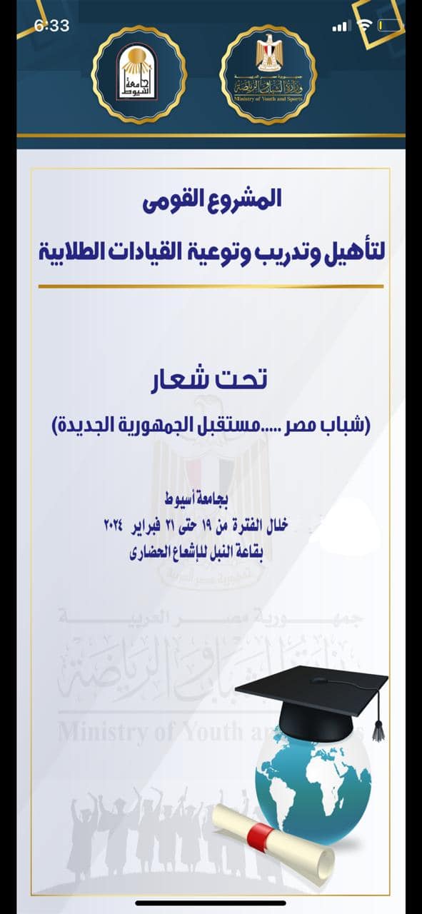 إدارة الاتحادات الطلابية بالإدارة العامة لرعاية الشباب .. المشروع القومي لتاهيل وتدريب وتوعية قيادات الاتحادات الطلابية بالجامعات المصرية تحت شعار "شباب مصر.. مستقبل الجمهورية الجديدة ٢٠٢٣ / ٢٠٢٤ بمركز النيل للتنوير والاشعاع الحضاري