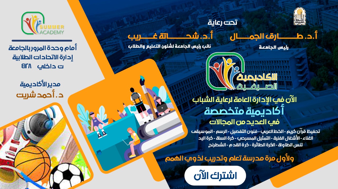 جامعة اسيوط تعلن عن إقامة مدارس ثقافية وفنية ورياضية تعليمية فى المجالات المختلفة خلال اشهر الصيف لجميع الاعمار السنية تقام داخل قاعات وحجرات التدريب بمبنى الادارة العامة لرعاية الشباب بجامعة اسيوط