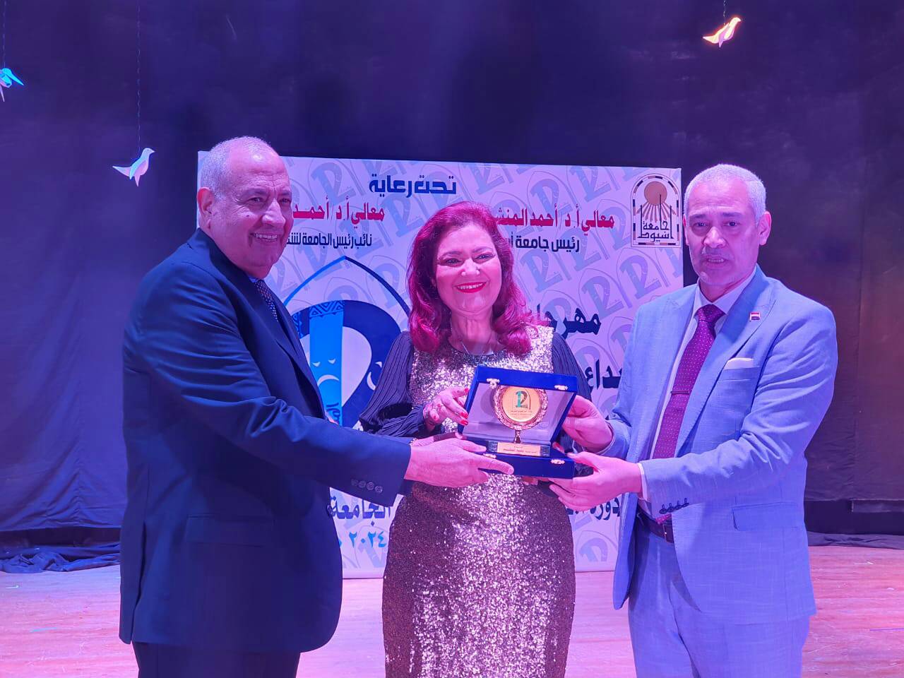 إدارة الفنون ..... قسم الفنون المسرحية والموسيقية .... الحفل الختامى لمهرجان " الابداع المسرحى الثانى عشر " تكريم صاحب الدورة الأستاذ الدكتور عزت عبدالله أحمد رئيس جامعة أسيوط الأسبق والسادة المكرمين من قبل أعضاء المهرجان بمسرح مركز النيل