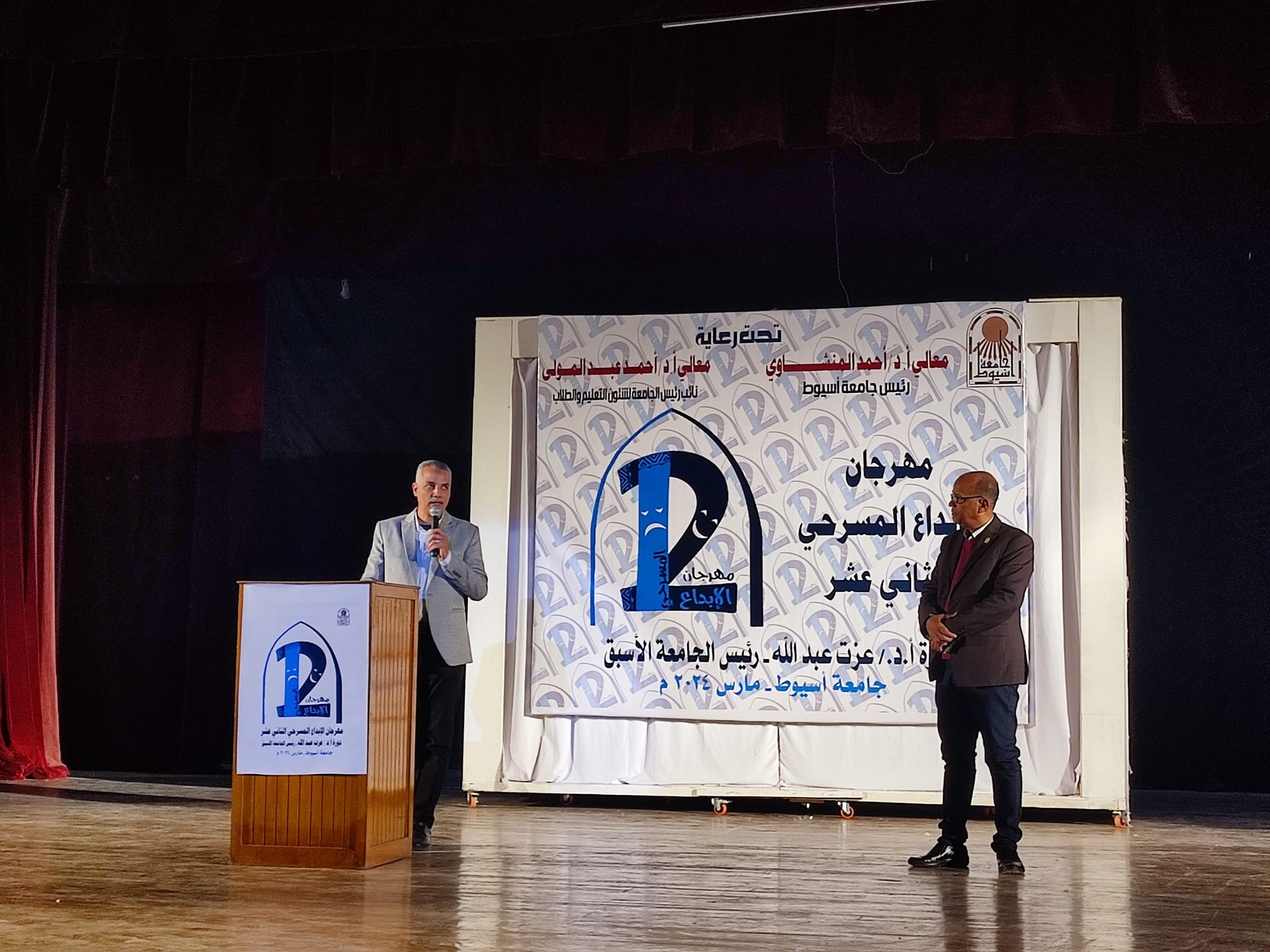 نظمت اليوم إدارة الفنون قسم الفنون المسرحية والموسيقية مهرجان الإبداع المسرحى الثانى عشر لطلبة وطالبات فرق الفنون المسرحية بكليات جامعة أسيوط