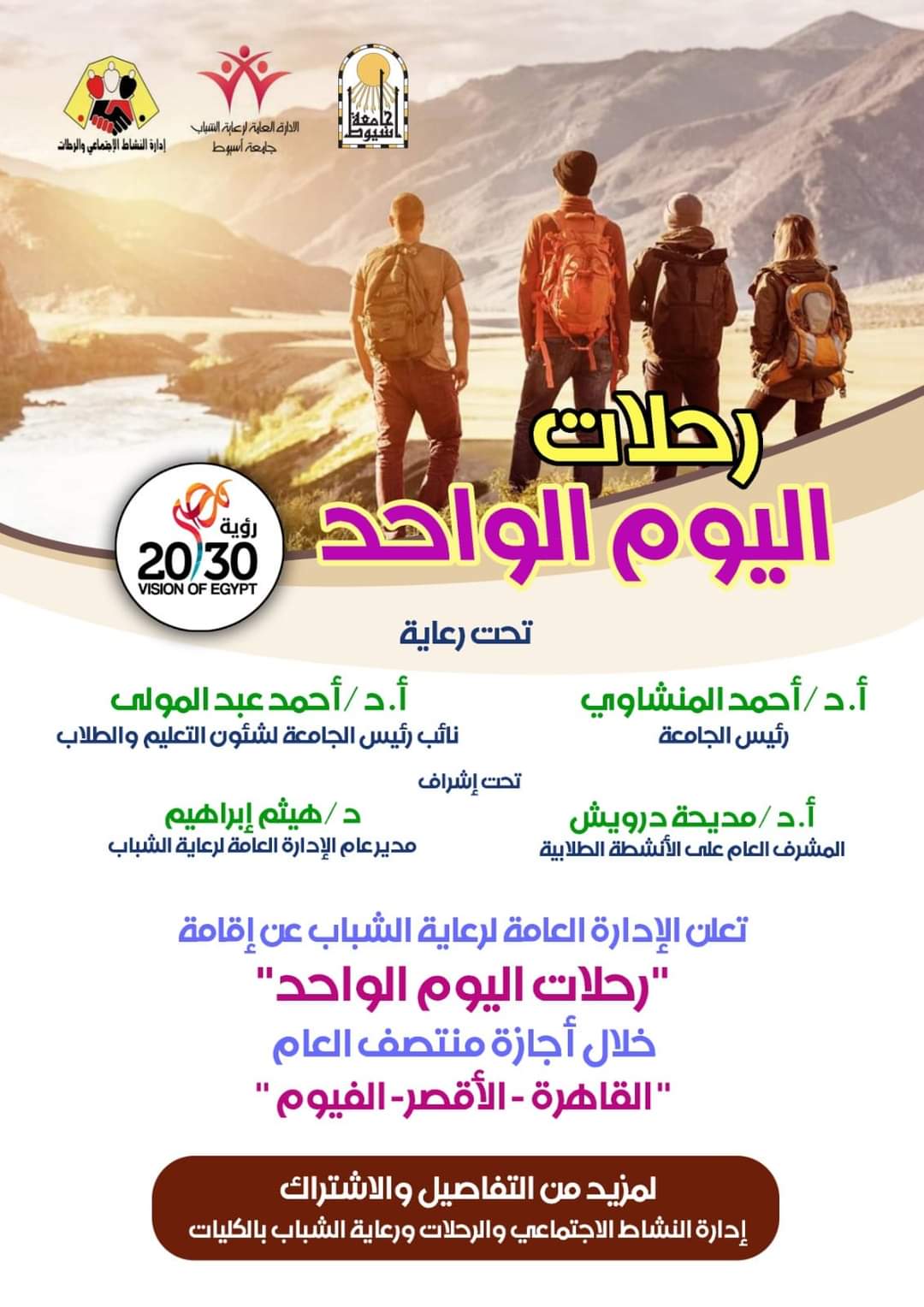 إدارة النشاط الإجتماعي والرحلات بالإدارة العامة لرعاية الشباب .. تعلن عن إقامة "رحلات اليوم الواحد" خلال أجازة منتصف العام  "القاهرة - الأقصر - الفيوم"