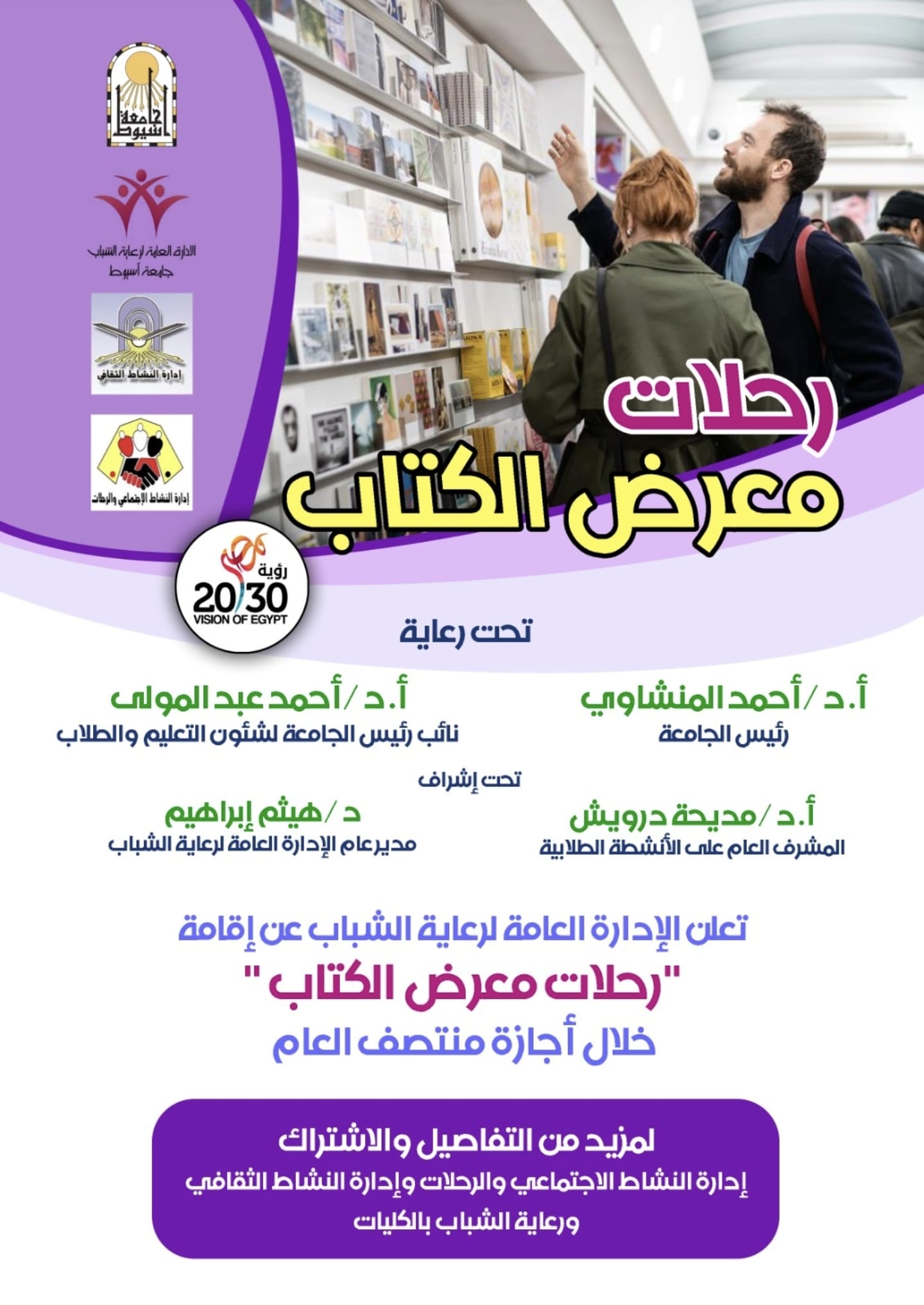 إدارة النشاط الاجتماعي والرحلات وإدارة النشاط الثقافى بالإدارة العامة لرعاية الشباب .. نظمتا سلسلة زيارات مجانية لطلاب الجامعة لمعرض الكتاب ألـ 55 ، حيث قسمت الزيارات الى 4 أفواج بحوالي عدد 400 طالب وطالبة