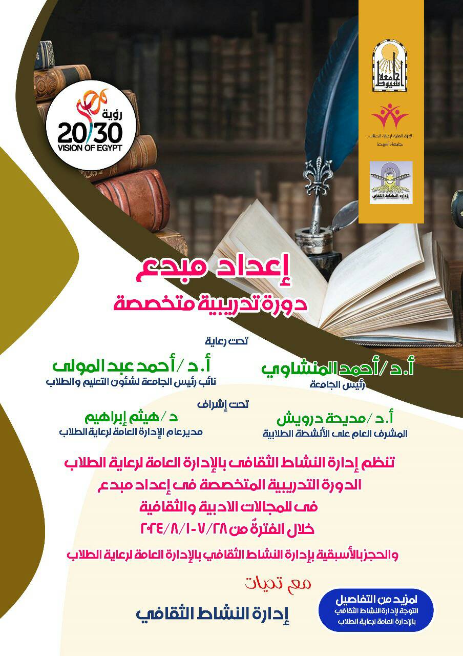 إدارة النشاط الثقافى بالادارة العامة لرعاية الطلاب .. دعوة للمشاركة فى دورة تدريبة متخصصة " إعداد مبدع " 9 يوليو 2024 1-اعلان التقدم للقيد للدبلوم 2-اعلان التقدم للقيد للماجستير 3- اعلان التقدم للقيد للدكتوراه
