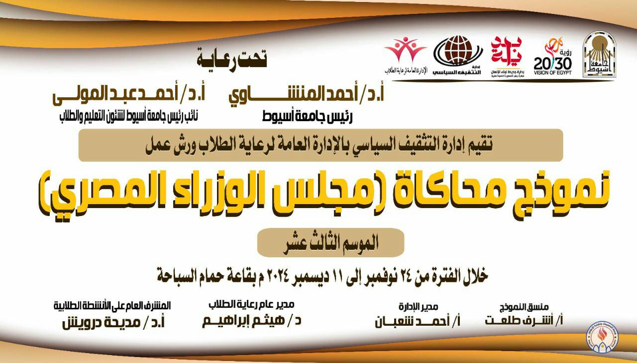 إدارة التثقيف السياسي .. تعلن عن بدء ورش عمل نموذج محاكاة مجلس الوزراء الموسم الثالث عشر وذلك خلال الفترة من ٢٤ نوفمبر الى ١١ ديسمبر ٢٠٢٤م بقاعة حمام السباحة