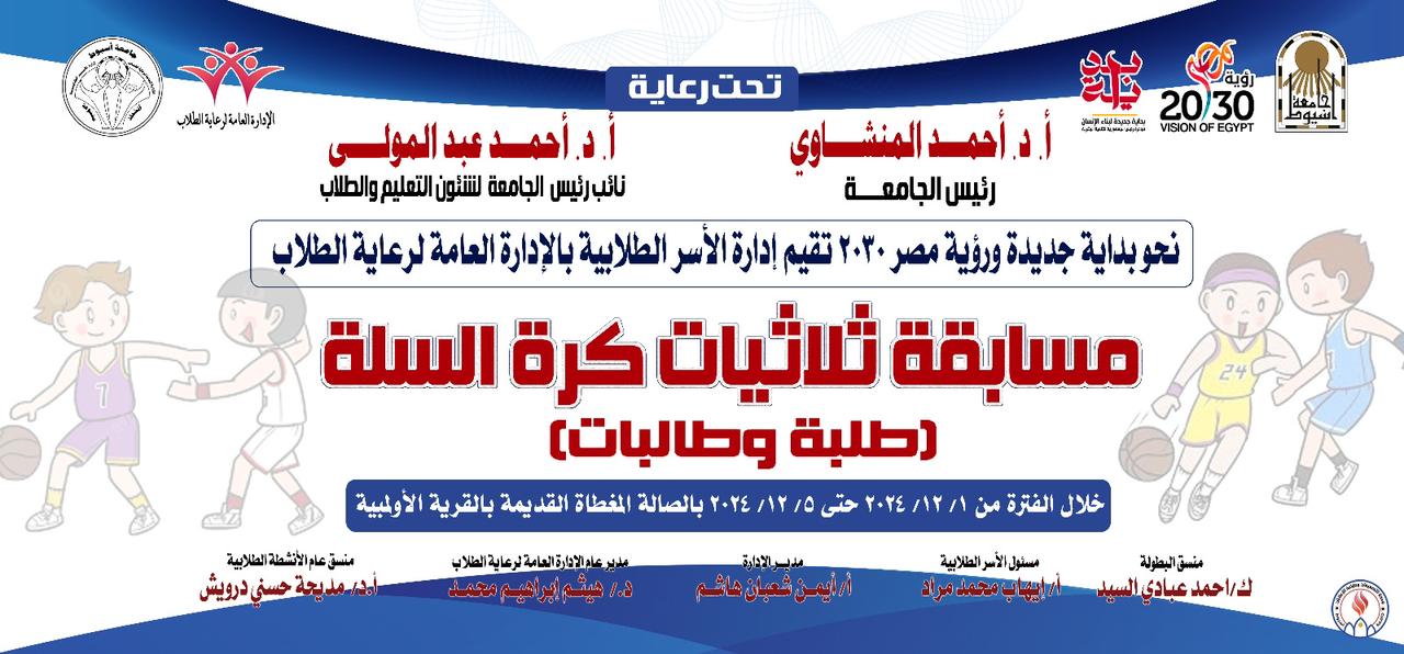 إدارة نشاط الأسر الطلابية .. تعلن عن مسابقة ثلاثيات كرة السلة طلبة وطالبات وذلك خلال الفترة من ١ الى ٥ ديسمبر ٢٠٢٤م بالصالة المغطاة القديمة بالقرية الأولمبية