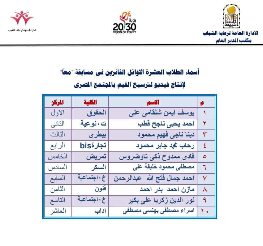 الادارة العامة لرعاية الشباب .. اعلان اسماء الطلاب العشرة الأوائل الفائزين علي مستوي كليات جامعة أسيوط في مسابقة " معا " لإنتاج فيدو قصير لترسيخ القيم الأ صيلة للمجتمع المصرى والذي اعلنت عنه وزارة التعليم والبحث العلمي وتم تصعيد أعمال العشرة الفائزين