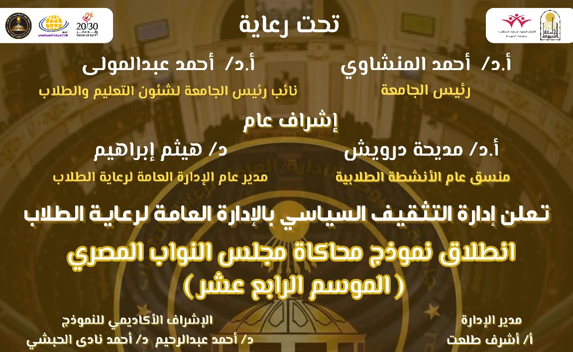 إعلان عن انطلاق نموذج محاكاة مجلس النواب المصري فى موسمه الرابع عشر لطلاب جامعة أسيوط - ادارة التثقيف السياسى بالإدارة العامة لرعاية الطلاب 14 أكتوبر 2025 الإستبيان الإلكتروني للطلاب