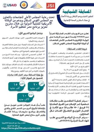 لتمكين الشباب ودعم الابتكار وريادة الأعمال فى مجال السكان والصحة الانجابية تحت رعاية المجلس الاعلى للجامعات بالتعاون مع المجلس القومى للسكان وبدعم من الوكالة الامريكية للتنمية الدولية من خلال مشروع تعزيز برنامج مصر لتنظيم الأسرة.