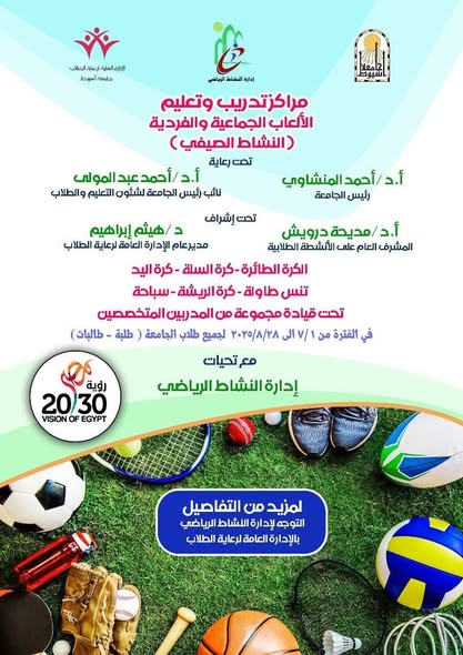 أستمرار فعاليات مراكز التدريب وتعليم الألعاب الجماعية والفردية بالنشاط الصيفي إدارة النشاط الرياضي بالإدارة العامة لرعاية الطلاب 5 أغسطس 2025 مناقشة رسالة الماجستير المقدمة من / صابر محمد عبد الله
