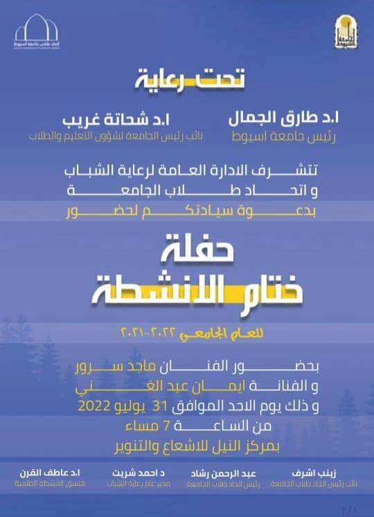 دعوه للحضور .. احتفال ختام الأنشطة الطلابية للعام الدراسى ٢٠٢١ /٢٠٢٢م