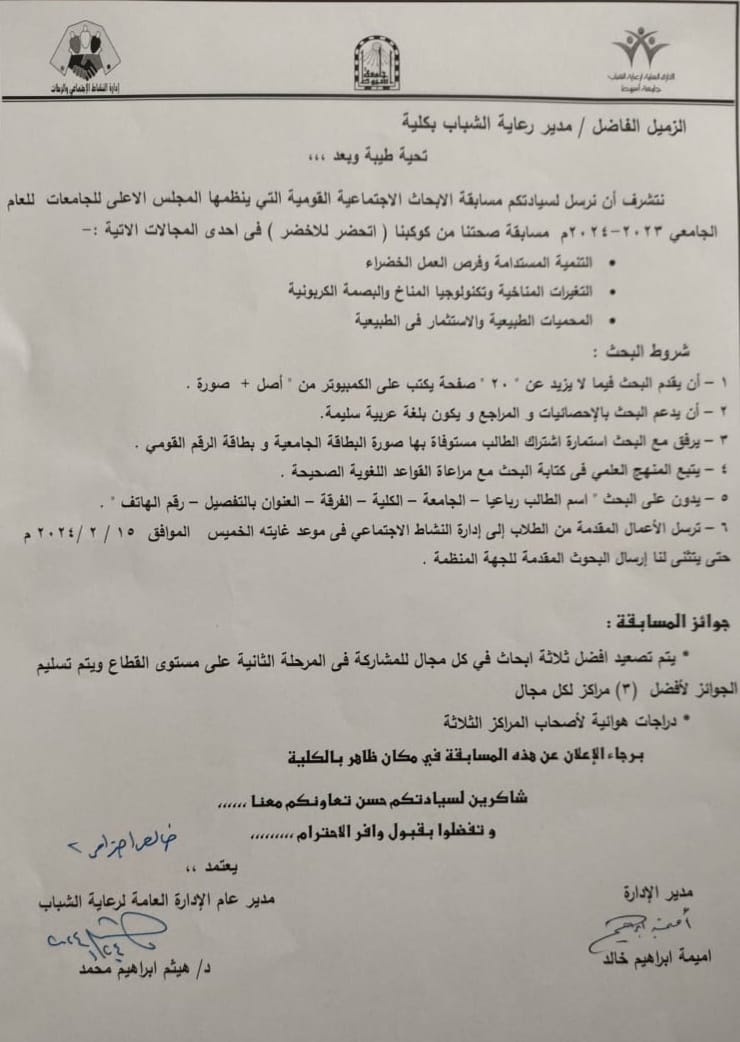 دعوه لمشاركة الطلاب في مسابقة الأبحاث الإجتماعية القومية ضمن مسابقة صحتنا في كوكبنا (اتخضر للاخضر)