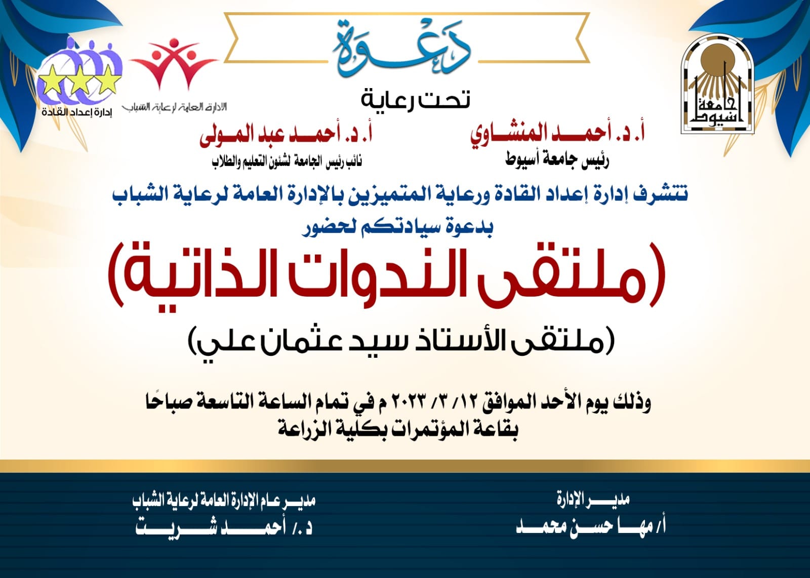 دعوة .. إدارة اعداد القادة ورعاية المتميزين بالادارة العامة رعاية الشباب ..ملتقى الندوات الذاتية على مستوى الكليات والمدن الجامعية " ملتقى الاستاذ سيد عثمان على " بقاعة المؤتمرات بكلية الزراعة