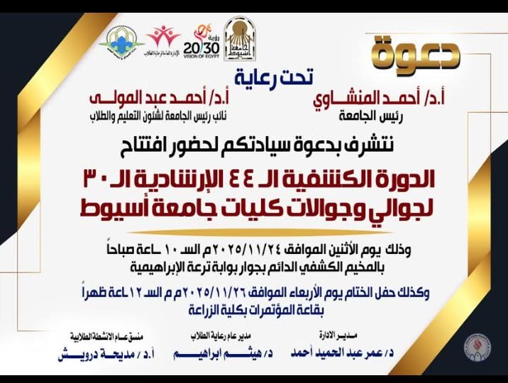 دعوة لحضور جميع الطلاب في افتتاح " الدورة الكشفية ال٤٤ الارشادية ال٣٠ لجوالي وجوالات كليات الجامعة " - إدارة الجوالة والخدمة العامة بالإدارة العامة لرعاية الطلاب
